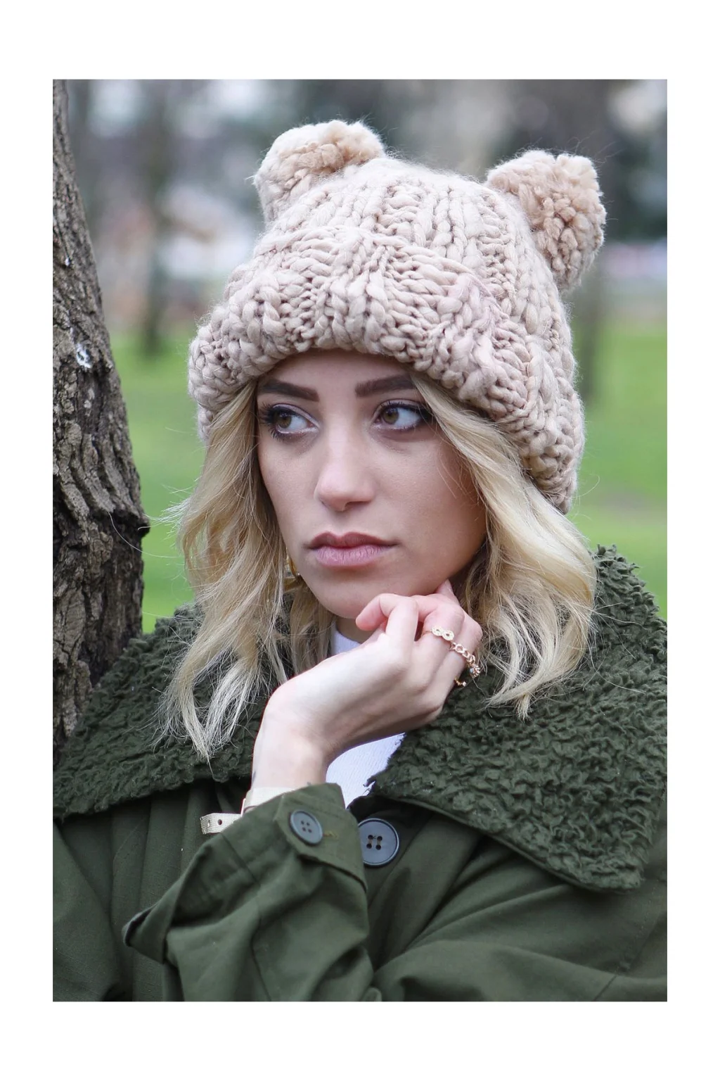 BAY ŞAPKACI - KADIN ÇİFT POMPONLU BEJ BERE 4114