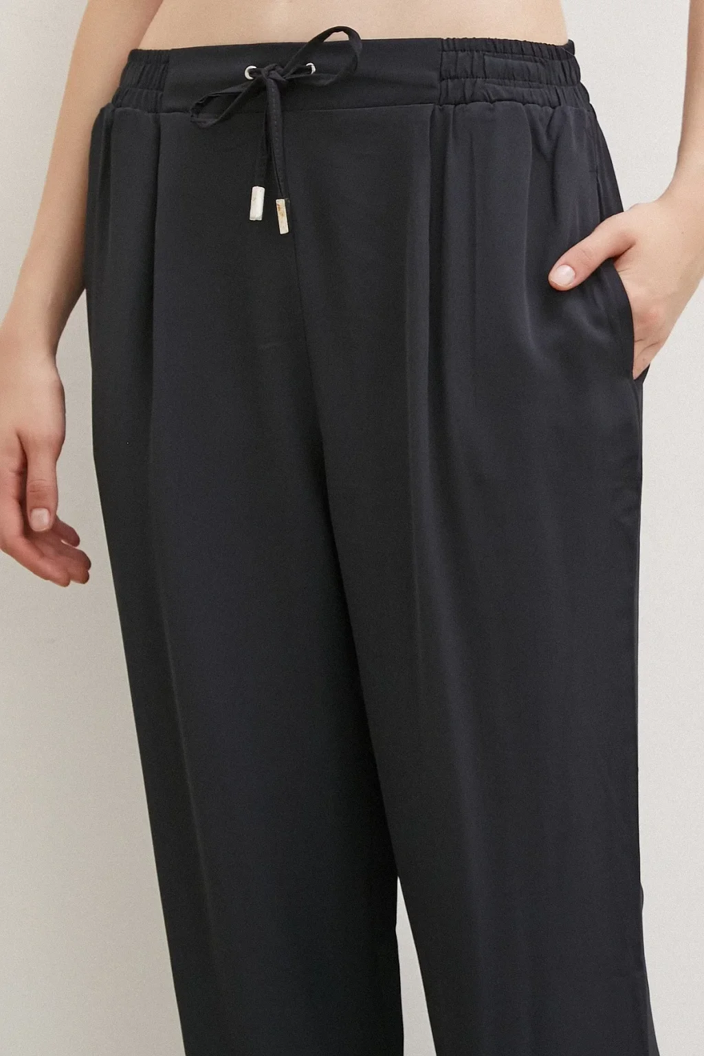 Bağcıklı Beli Lastikli Pileli Pantolon Siyah