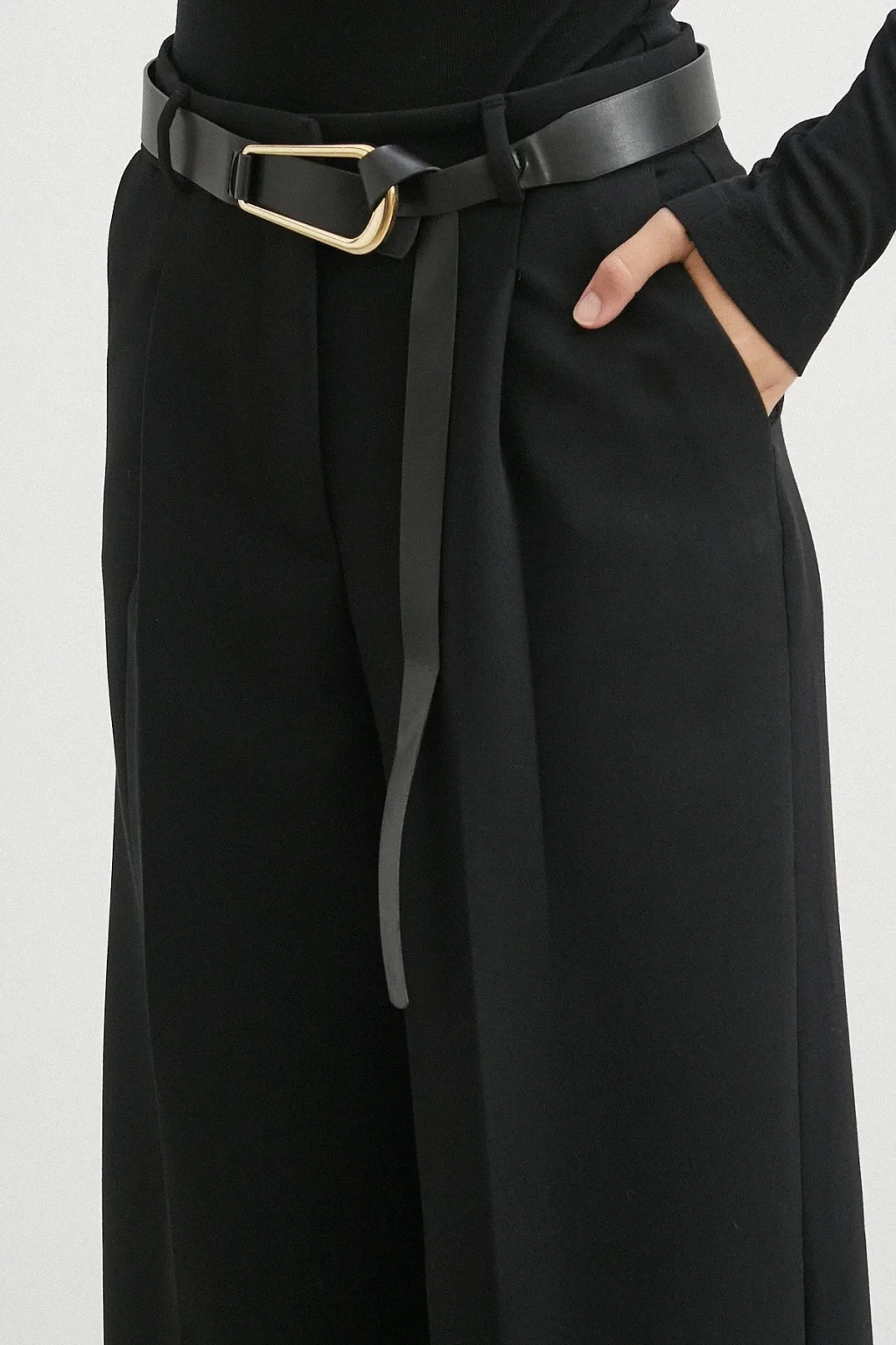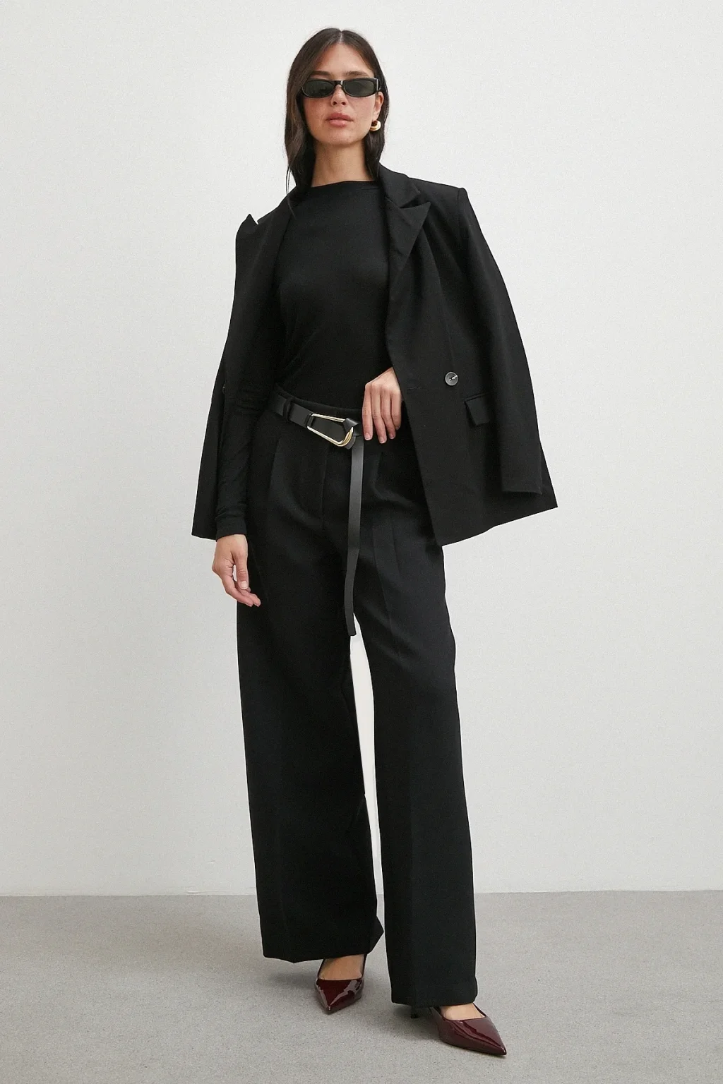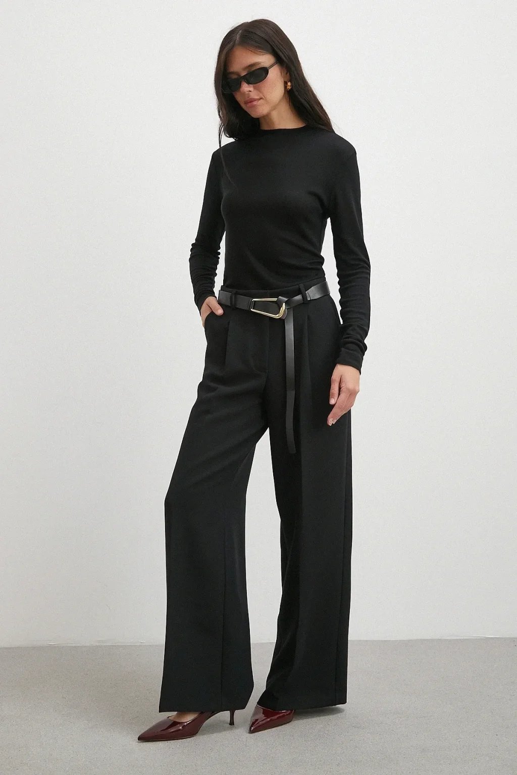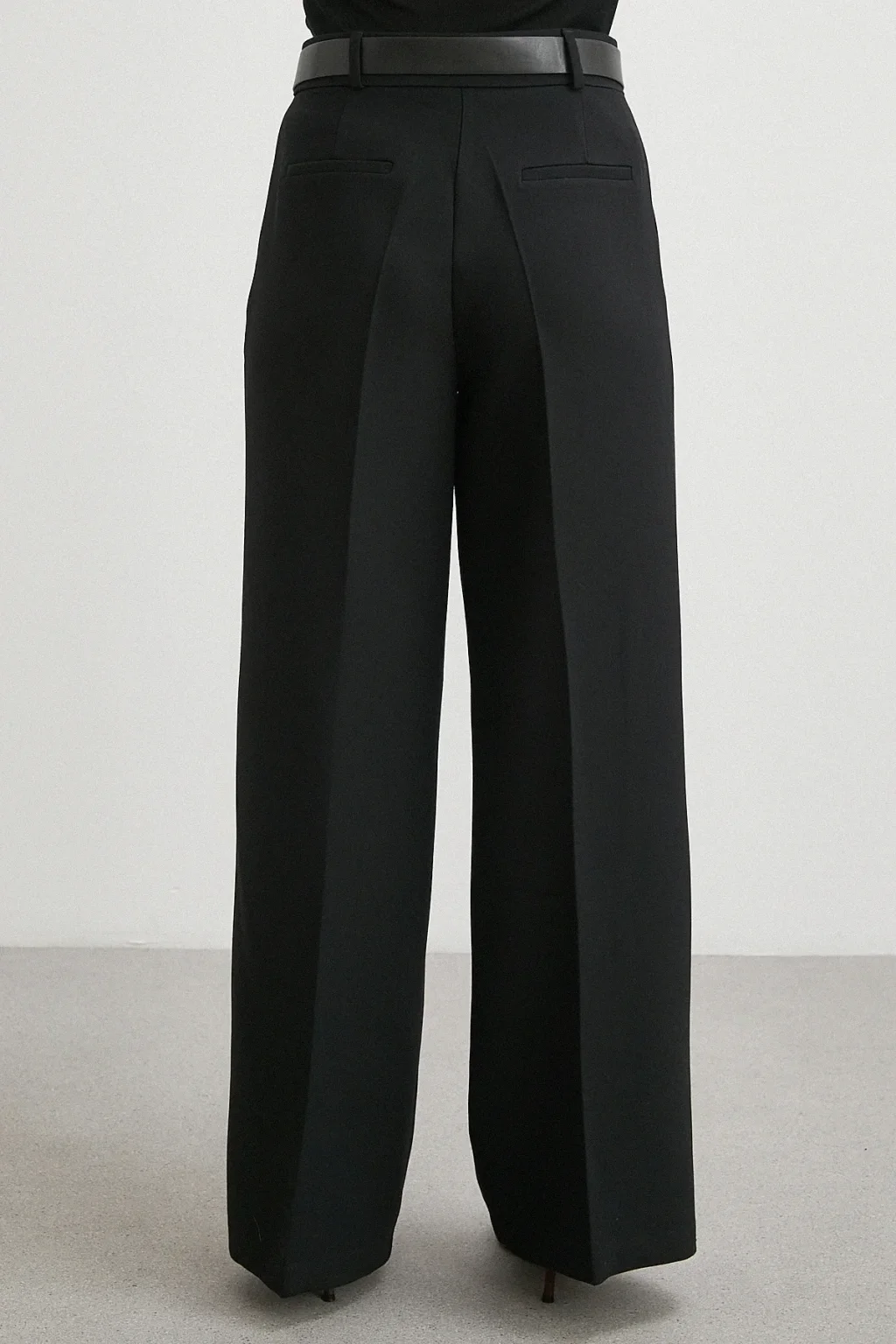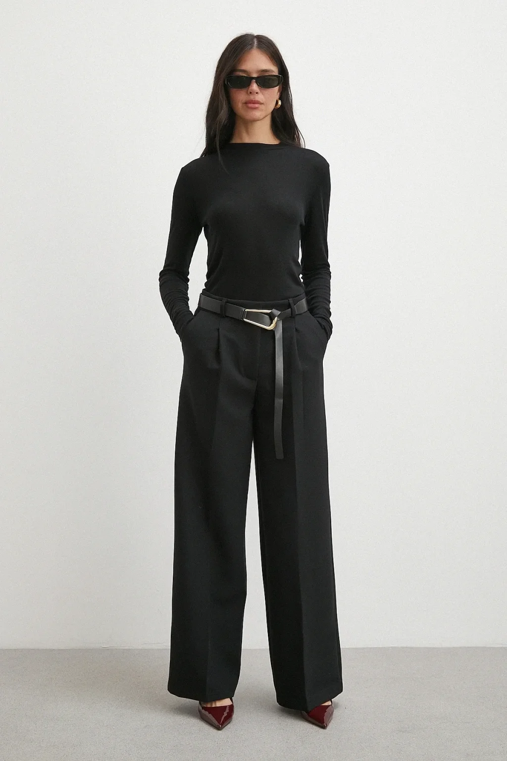 Deri Kemerli Geniş Paça Pantolon Siyah
