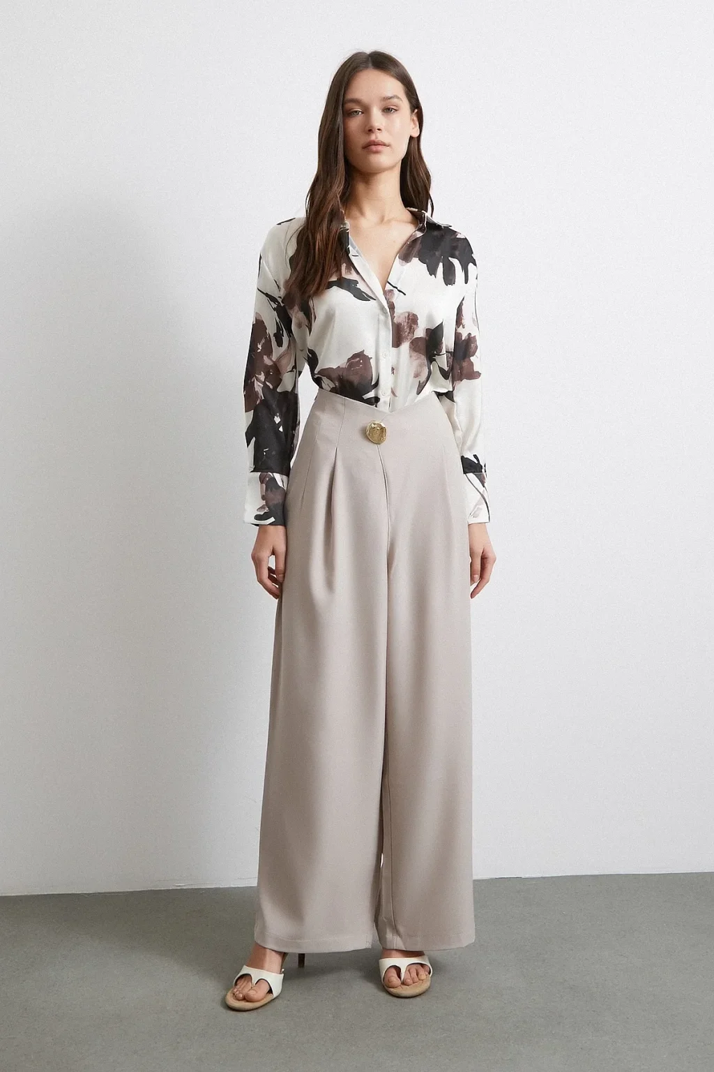 Yüksek Bel Pileli Palazzo Pantolon Gri