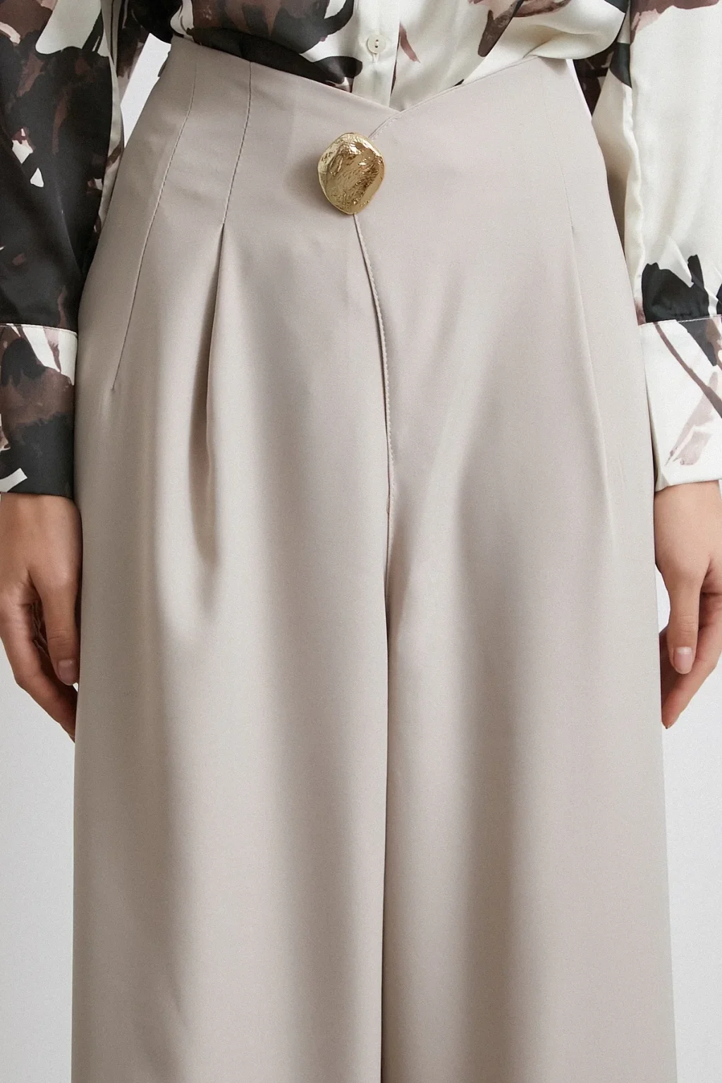 Düğme Detaylı Pensli Dökümlü Pantolon Bej