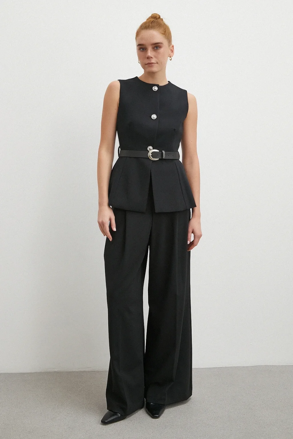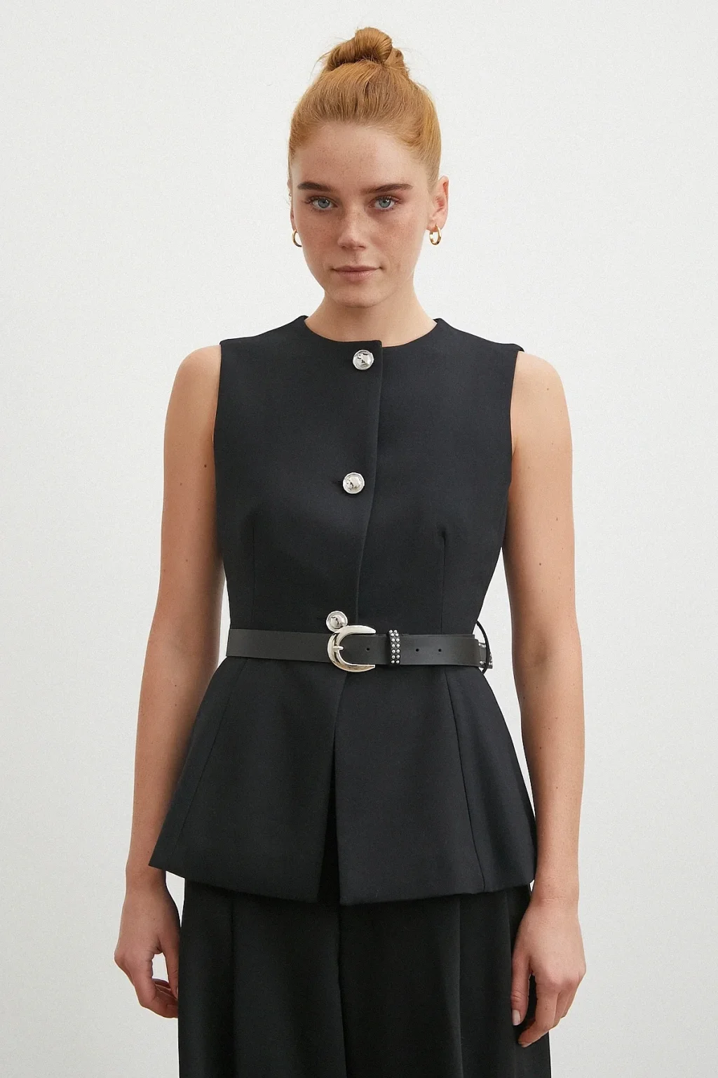 Kemerli Bisiklet Yaka Üç Düğmeli Yelek Siyah