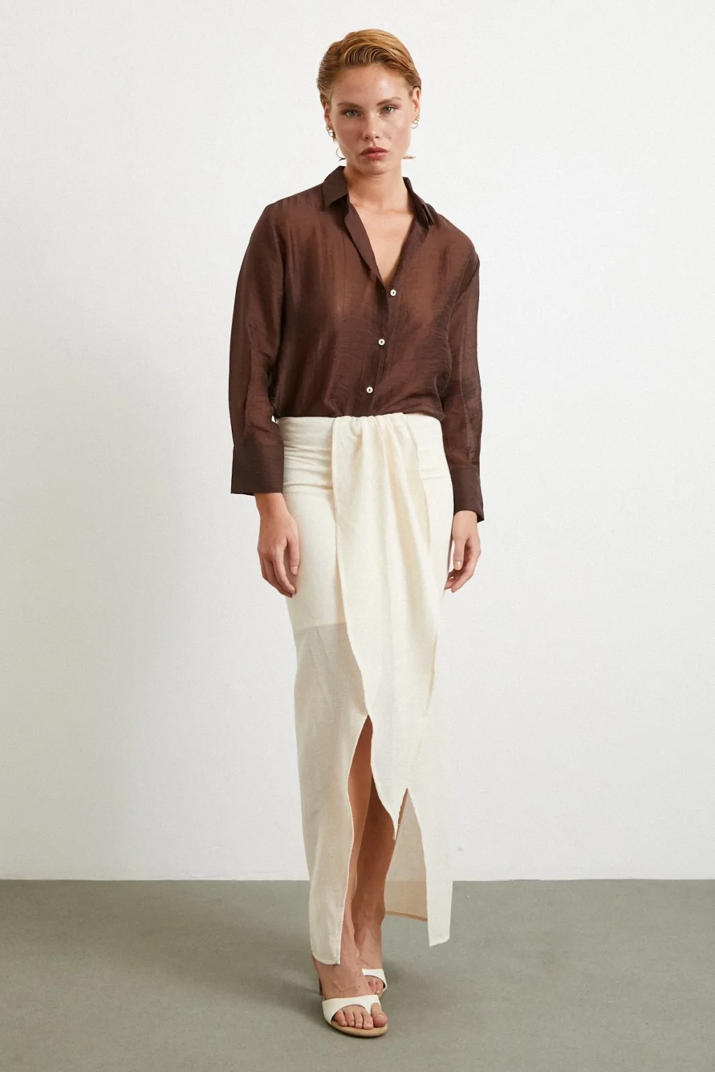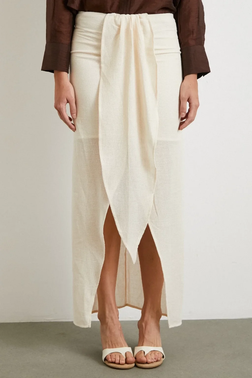 Önü Bağlamalı Yırtmaçlı Etek Ekru
