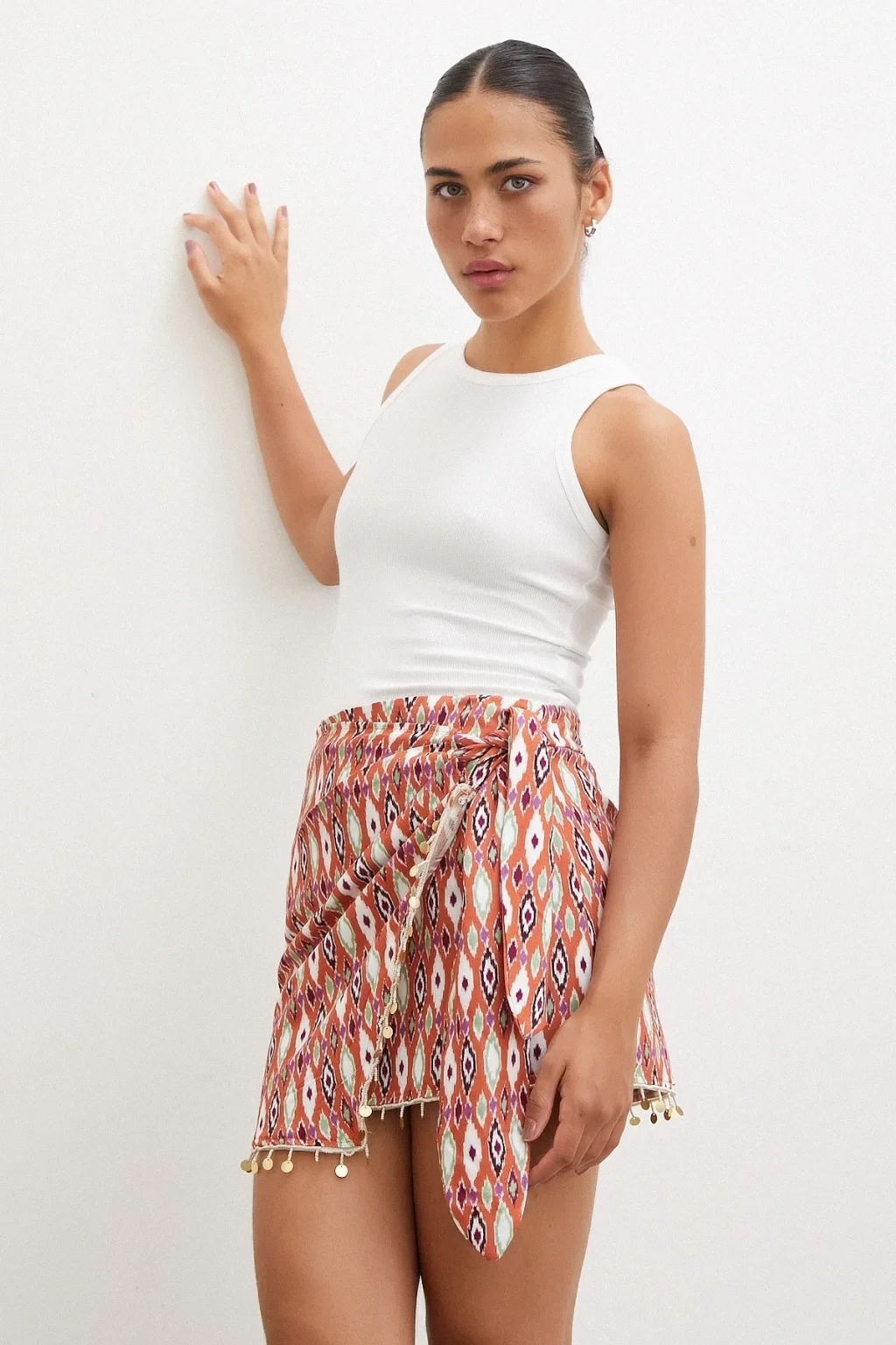 Pul Aksesuarlı Bağlamalı Mini Etek Kiremit